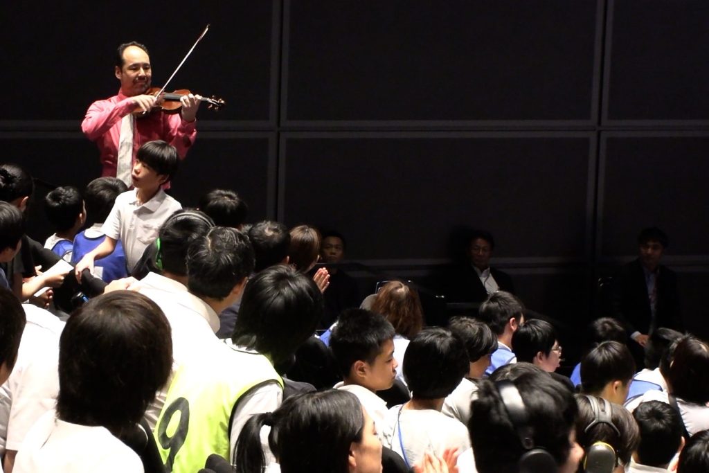 NHK交響楽団のメンバーによるアンサンブルでは、クラシックの名曲から親しみやすい楽曲まで、幅広い演目を演奏いただきました。また、弦楽器・打楽器・ピアノといった楽器の音の出る仕組みについても、楽しくわかりやすくご紹介していただきました。後半には生徒たちが舞台前に出て、演奏に合わせて元気いっぱいに歌声を響かせ、会場は一体感とあたたかさに包まれました。