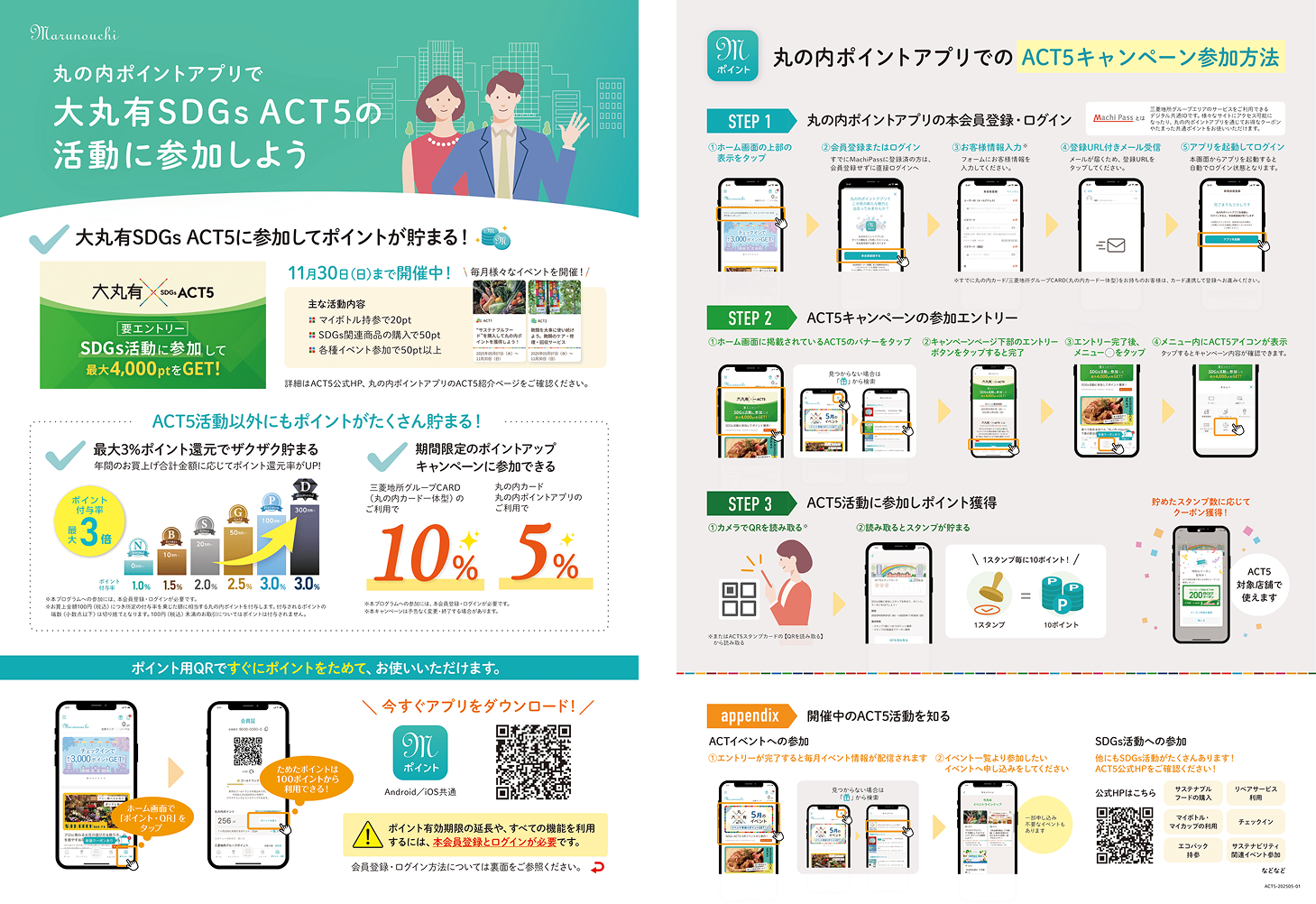 丸の内ポイントアプリ上で実施しておりました2025年度「ACT5キャンペーン」は、2025年11月30日をもちまして終了いたしました。多くの皆さまにご参加いただき、誠にありがとうございました。なお、キャンペーンにて獲得されたクーポンは2026年2月末日までご利用いただけますので、ぜひお早めにご活用ください。次回の「ACT5キャンペーン」は2026年5月頃の開始を予定しております。引き続き、皆さまのご参加を心よりお待ちしております。